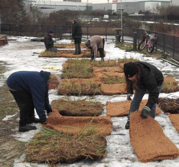 In the dawn of 2013, a bunch of brave volunteers came out in the snow and rain to construct green wall modules for our Greening the Lea project. The River Lea suffers from its journey through our capital; its man-made concrete banks provide little habitat for wildlife and misconnected home plumbing and combined sewage overflows have a drastic effect on the water quality of the river and it’s tributaries.