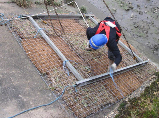 squared ‘pallets’ of coir mesh that have been sewn together by some very dedicated volunteers. Five of these ‘pallets’ are established with aquatic plants whilst the remaining four have been left unplanted to self-seed. These pallets are encased in a mesh ‘sandwich’ and attached to the sloped concrete banks of the river.