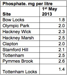 Sadly these University College London lab results were typical for the Lea. Phosphate levels (from sewage and detergents) are double the ‘Bad’ rating. Anything higher than 1mg of phosphate per litre has a damaging effect on the ecological balance of a river. Most of the sites tested are double this. Not one is below 1mg/l. To be healthy, the Lea needs to have less than 0.5 mg of phosphate per litre.