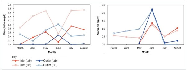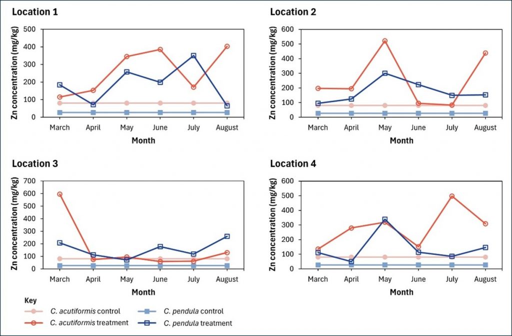 - Zinc and copper concentrations were highest at the outfall where road run-off pollution enters the wetland and lowest at the end of the wetland, with zinc reduced by 66% and copper reduced by 43%, showing that the system could be trapping and removing these pollutants.