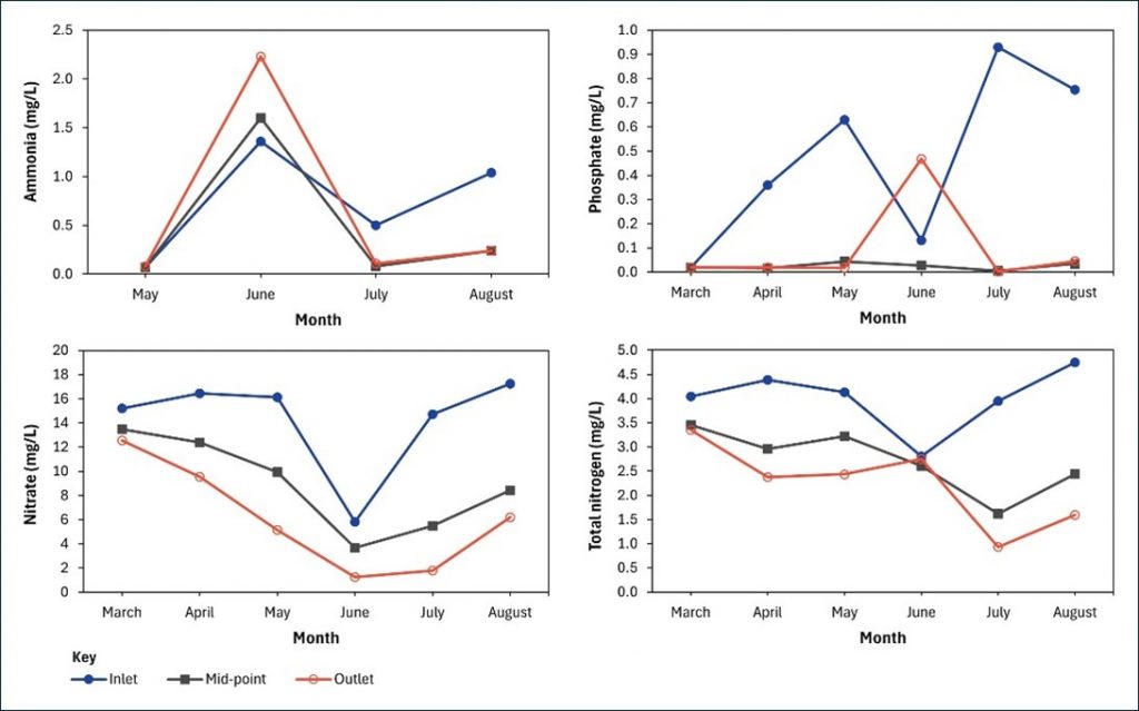 - An improvement in water quality as it moves through the wetland. Trends suggest an increase in dissolved oxygen content (important for the fish in the lake) and reduction of nutrient load within the water. This is supported by readings of an 110% increase in dissolved oxygen content and 80% reduction in phosphate levels.