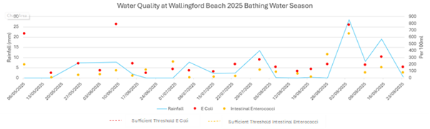 Monitoring shows that higher bacteria readings tended to follow periods of rainfall, indicating that levels at Wallingford Beach generally remain within safe limits during dry weather. A similar pattern was recorded in 2024, when water quality was mostly strong apart from two brief spikes linked to heavier rain.