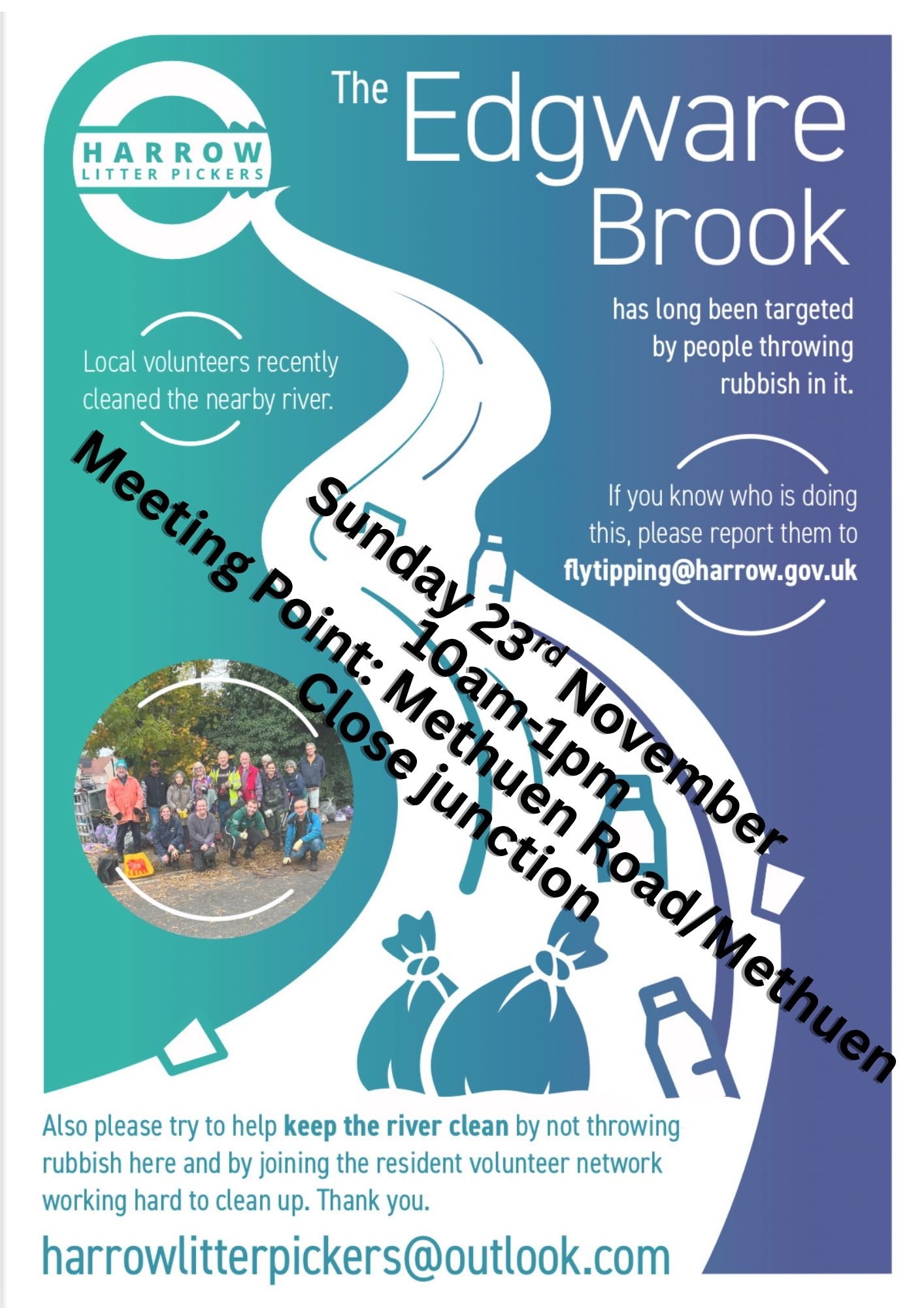 Join us on Sunday 23rd November for a joint venture with the Harrow Litter Pickers to clean up the stream and surrounding banks from Methuen Close towards the A5.