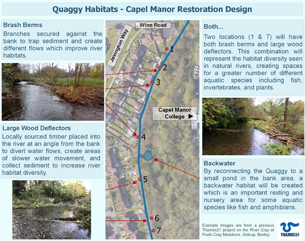 The River Quaggy is a 17km river flowing through the London Boroughs of Bromley, Greenwich and Lewisham before joining the River Ravensbourne, one of the tributaries of the River Thames, in central Lewisham. The Quaggy experiences similar pressures to many of the rivers in Greater London, with large stretches of modified concrete channels and culverts, as well as water quality issues created by road runoff, misconnections, and urban pollution. These factors all lead to reduced overall ecological quality of the Quaggy.