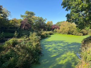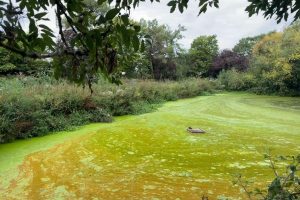 During the summer months, this caused extensive algal growth in the pond. As this algae dies off in autumn and winter, the breakdown of the algae by bacteria will cause very low oxygen levels in the pond which is damaging for freshwater life. This process is known as eutrophication.